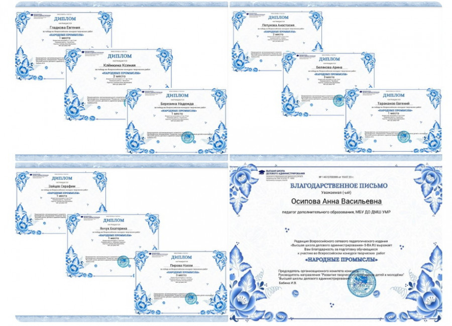 Обучающиеся эстетического отделения дистанционно приняли участие во Всероссийском конкурсе творческих работ "Народные промыслы" и получили дипломы победителей. Поздравляем ребят и их педагога Осипову А.В. с победой!