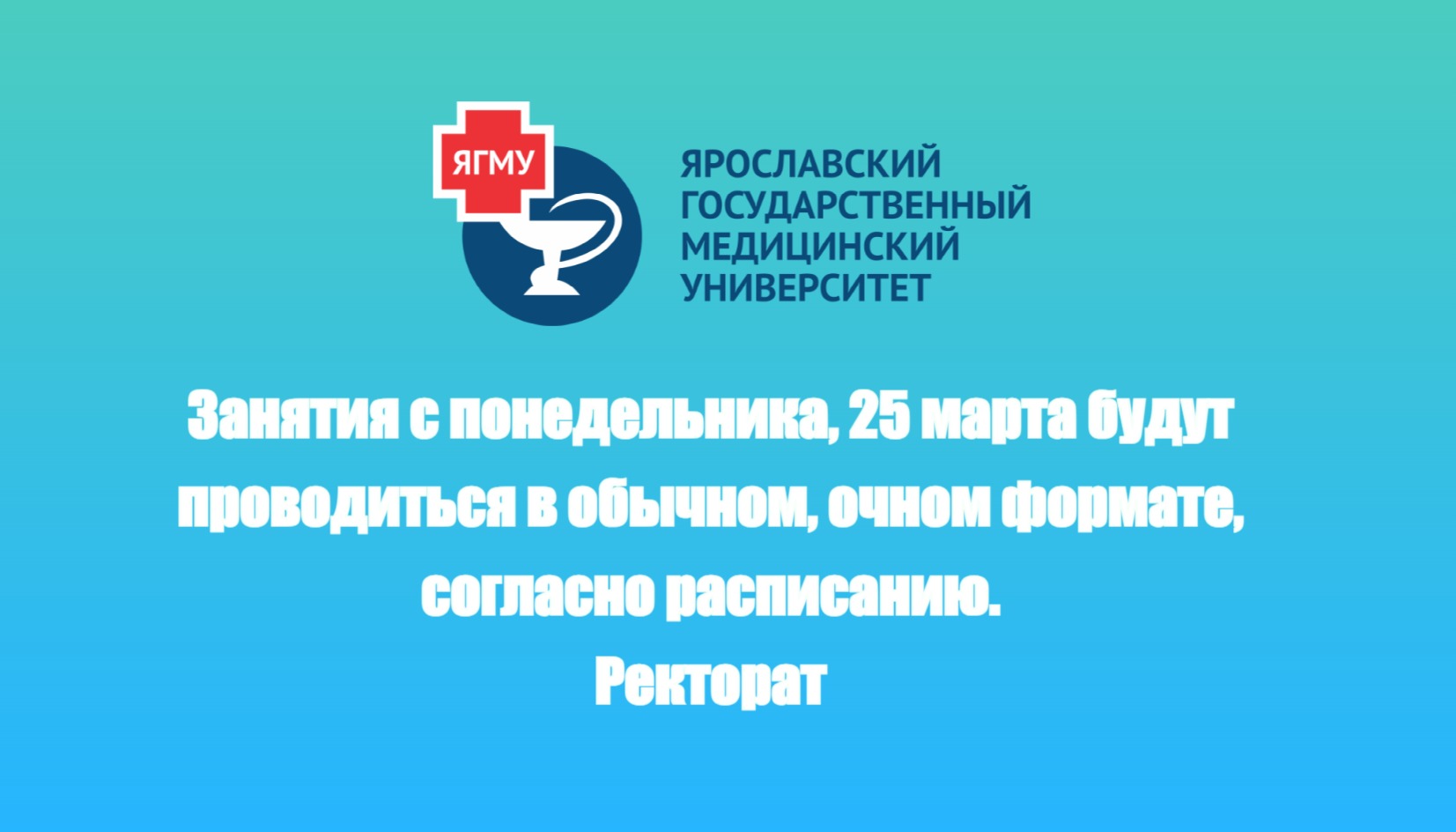 ЗАНЯТИЯ В ЯГМУ С ПОНЕДЕЛЬНИКА, 25 МАРТА, БУДУТ ПРОВОДИТЬСЯ В ОБЫЧНОМ, ОЧНОМ ФОРМАТЕ, СОГЛАСНО РАСПИСАНИЮ.