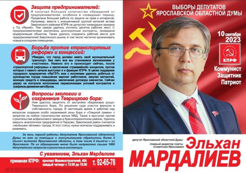 Кандидат в депутаты Ярославской областной Думы 8 созыва, первый секретарь Заволжского районного комитета КПРФ, главный редактор газеты «Советская Ярославия» Эльхан Мардалиев представил свой буклет, рассказывающий о работе,