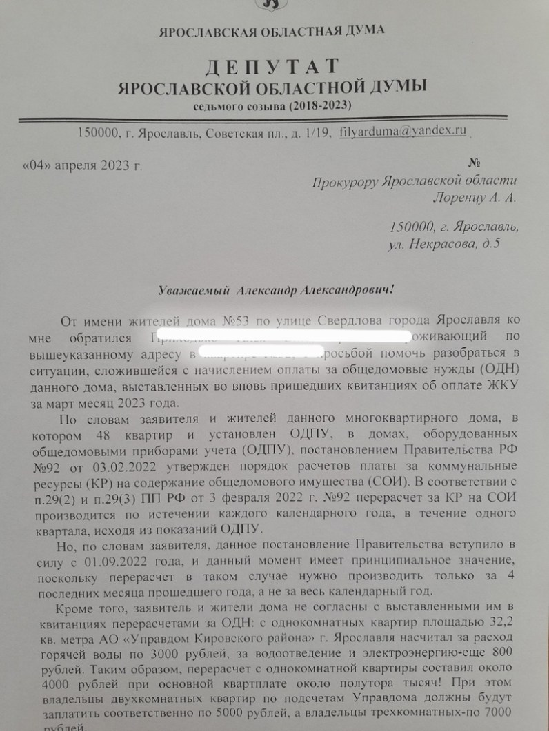 Причиной депутатского обращения Алексея Филиппова к прокурору Ярославской области Александру Лоренцу стали полученные жителями в апреле квитанции с начисленными суммами перерасчета за ОДН. Так как постановление Правительства РФ о порядке расчета платы за содержание общедомового имущества вступило в силу с 1 сентября 2022 года, то и перерасчет должен производиться не за целый год, а за четыре месяца. Депутат считает, что подобные начисления незаконны и завышены, а суммы взяты «с потолка», расчет по статье содержание и ремонт жилья жильцам не был предоставлен. По сведениям жителей дома, в подобных девятиэтажках по улице Свердлова №49 и №51 такого перерасчета с огромными суммами долга не было. Жители предполагают, что эти, для многих неподъемные суммы, могли появиться в платежках из-за находящихся на первом этаже магазинов.