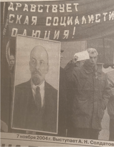 За трибуной А.Н. Солдатов. В Президиуме слева направо: Е.Г. Шувалов, В.И. Корнилов, В.И. Бочаров, Г.С. Вихров11 июля мы участвовали в большом митинге, посвященного трем датам: месяцу со дня открытия шахтерского лагеря, 8-летию движения шахтеров и светлой памяти Л. Рохлина, лидера движения, депутата ГосДумы РФ, убитого 2 июля 1998 года. В бытовую версию случившегося никто из нас не верил. Его смерть была нужна тем, кто не желал видеть Россию сильной и независимой от Запада во главе с США. Пребывая в лагере, мы обзавелись новыми знакомыми по протестному движению. Тогда окончательно у нас созрела мысль подобный бессрочный протестный лагерь организовать в Ярославле с целью подготовки к блокаде Москвы». Благодаря таким, как он, на Ярославской земле возник известный на всю Россию «Рабочий пикет-80» у ст. Приволжье, который на протяжении почти 3-х месяцев стал Центром протестного движения на территории Ярославской области.