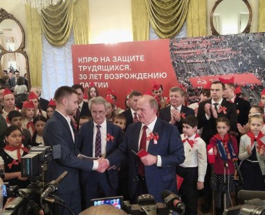 Лидер КПРФ Геннадий Зюганов перед концертом вручил активистам партийные билеты. Среди них – Сергей Захарченко, сын погибшего главы Донецкой Народной Республики Александра Захарченко, и двоюродный правнук начальника дивизии Красной армии Василия Чапаева.