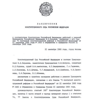 Спустя несколько часов Конституционный Суд под председательством В.Д.Зорькина принял Заключение о наличии оснований для отрешения Президента Б.Н. Ельцина от должности. А экстренно собранный Верховный Совет, а затем и съезд народных депутатов РСФСР отправили Ельцина в отставку и назначили и.о.президента тогдашнего вице-президента генерала Александра Руцкого.