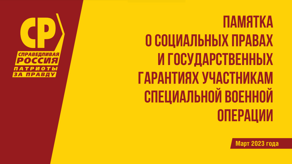 Актуальные, юридически точные и исчерпывающие ответы на эти и другие вопросы можно найти в Памятке о социальных правах и государственных гарантиях участникам специальной военной операции. Её подготовила Партия СПРАВЕДЛИВАЯ РОССИЯ – ЗА ПРАВДУ .