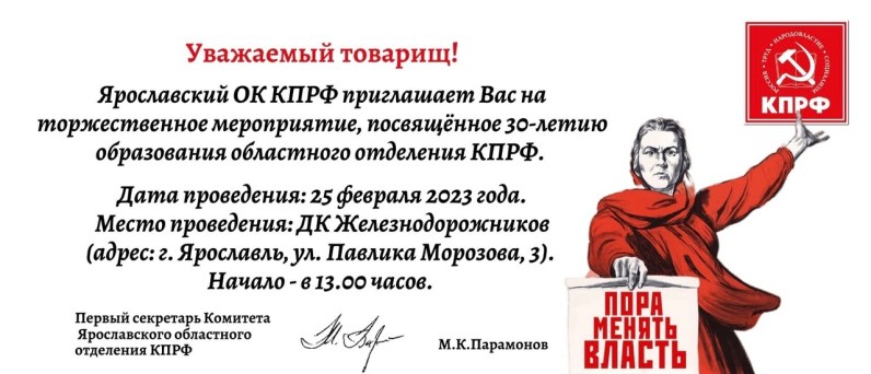 Уважаемые товарищи! Ярославский обком КПРФ приглашает всех жителей области на торжественное мероприятие, посвященное 30-летию образования областного отделения КПРФ.