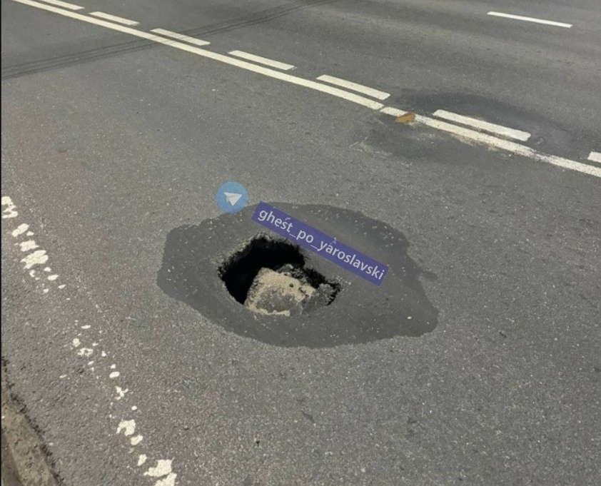 Большая яма образовалась на Московском проспекте, рядом с жилым комплексом. Фото дыры в асфальте горожане публикуют в соцсетях.