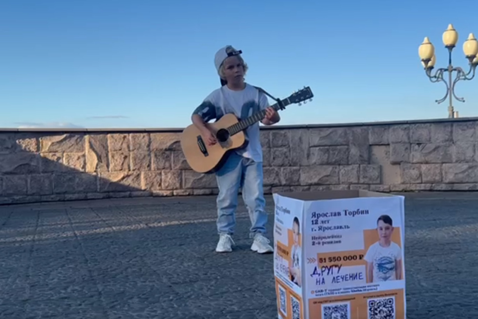 Строчки из самой печальной песни Басты звучали из уст 10-летнего мальчишки на Волжской набережной в Рыбинске. Белокурый музыкант вышел туда с большой гитарой, явно ему не по размеру, светлой футболке и голубых джинсах. Вокруг него стояла толпа зрителей — зевак, чье внимание летним вечером привлек тонкий детский голос, исполняющий серьезные «взрослые» песни. У ног мальчонки стояла картонная коробка с фотографией улыбающегося ребенка. На ней маркером было написано: «Другу на лечение». Туда зеваки изредка подкидывали завалявшуюся в кармане мелочь.