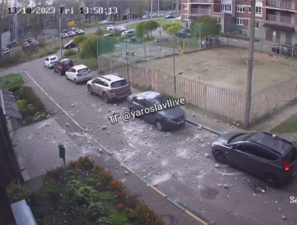 Речь идёт о доме №2 по улице Спасской. На кадрах видно, как в какой-то момент град из обломков кирпичей осыпается на припаркованные рядом с домом машины. Судя по камере, людей в этот момент рядом не было.