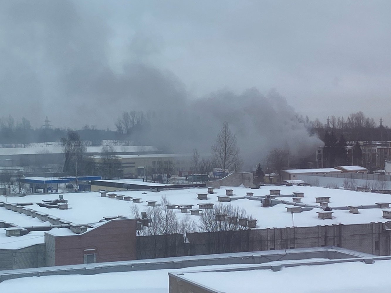 Запись, на которой видно, что над территорией АТП «Ярославское» поднимается столб дыма, появилась в социальных сетях около 14 часов 20 минут.