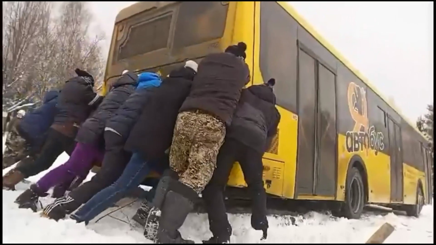 Видео толкающих желтый автобус пассажиров появилось в ярославских пабликах. По картинке видно, что автобус увяз в снежной каше. Люди пытаются вытолкать его. Причем толкают в основном женщины. Комментаторы в соцсетях начали было возмущаться, а почему не толкает автор видео, но это быстро выяснилось.