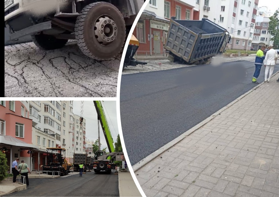 Фото и видео происшествия вечером 10 июля появилось в социальных сетях. В ролике и на фотографиях хорошо заметны уже асфальтированная полоса проезда, и китайский грузовик Faw, одним колесом провалившийся под землю. Причем вторую полосу тоже явно собирались асфальтировать - следы подготовки в виде специальной эмульсии видны на дороге. Однако, процесс укладки нового асфальта пришлось остановить и вызвать на место автокран, который и вытащил грузовик из дорожного плена.