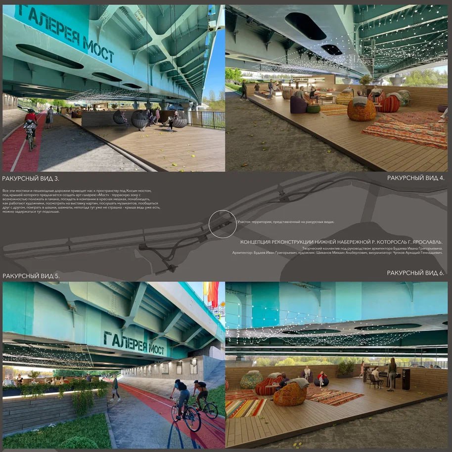 — Среди финалистов конкурса было четыре творческих объединения из Ярославля и столицы. Участники презентовали свои эскизы, после чего состоялось тайное голосование за понравившиеся проекты. Победителем конкурса стало объединение ярославских архитекторов и художников. Эскиз, набравший наибольшее количество голосов, создали Иван Будаев, Михаил Шиханов и Аркадий Чупков. По проекту авторов, на Которосльной набережной могут разместиться пешеходные дорожки с выходом к воде. А пространство под мостом художники предлагают превратить в арт-галерею, — рассказал об итогах конкурса в своих социальных сетях Артём Молчанов.
