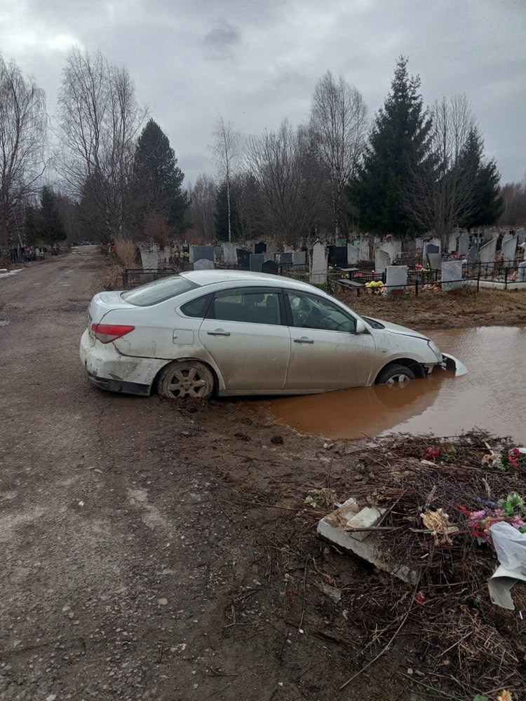 Машина на фото застряла там утром 4 апреля. За помощью к работникам кладбища водитель не обращался. На снимке видно, что автомобиль потерял передний бампер. Мы попросили мэрию города прокомментировать ситуацию с подтоплением кладбища.