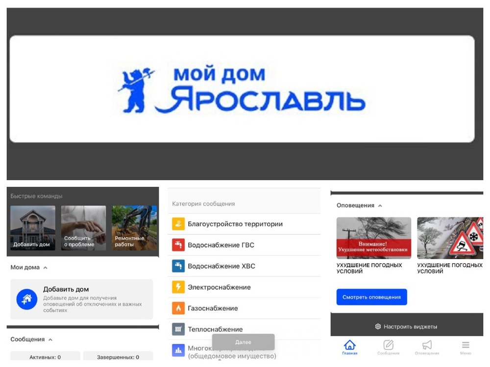Далее пользователи попадают на главную страницу приложения. Там они могут добавить адреса домов, по которым их интересует информация об отключениях воды или электричества, а также о проведении ремонтных работ. Также в приложении ярославцы видят оповещения об ухудшении погодных условий и новости города.