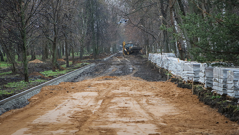 В Волжском парке работает тяжелая техника. Строители выставляют бордюры на главной аллее от Луначарского до памятника Павлу Батову, формируют основание пешеходной дорожки и тропу здоровья.