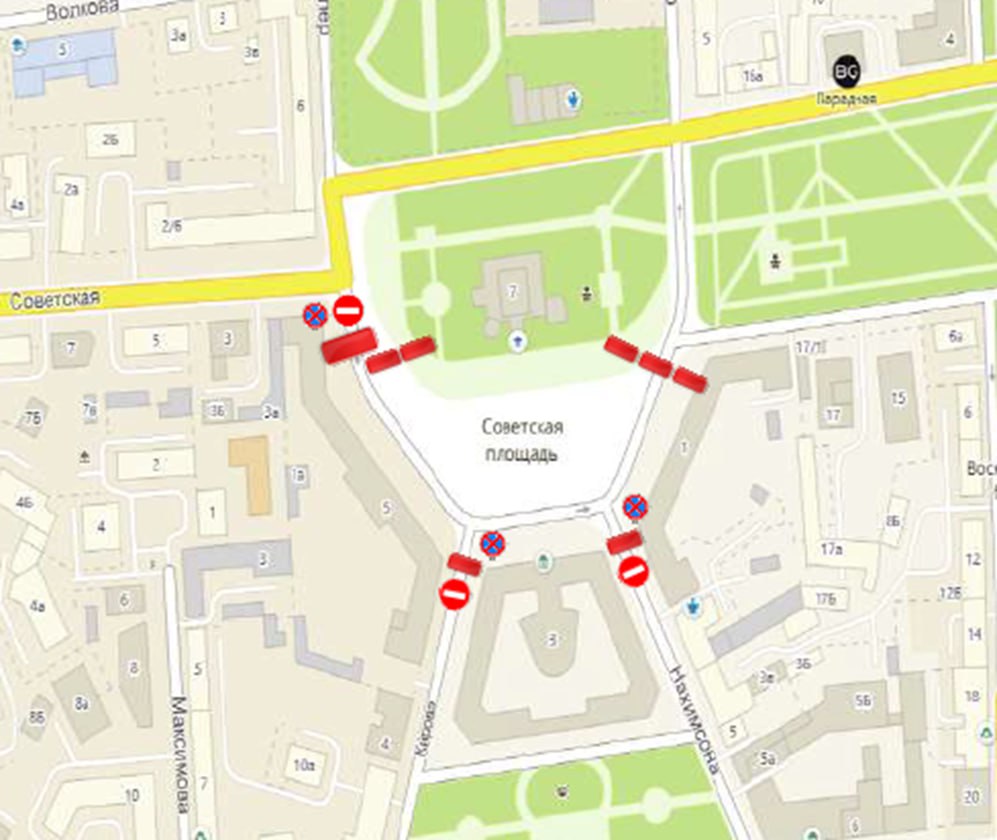 В целях обеспечения необходимого уровня безопасности дорожного движения в период проведения репетиций праздничной программы на Советской площади посвящённой празднованию 78-й годовщины Победы в Великой Отечественной войне 1941-1945 годов на участках улиц Кирова, Нахимсона, Советская площадь 24.04.2023 -08.05.2023 с 08.00 часов до 21.00 часов вводится временное ограничение движения, остановки и стоянки транспортных средств.