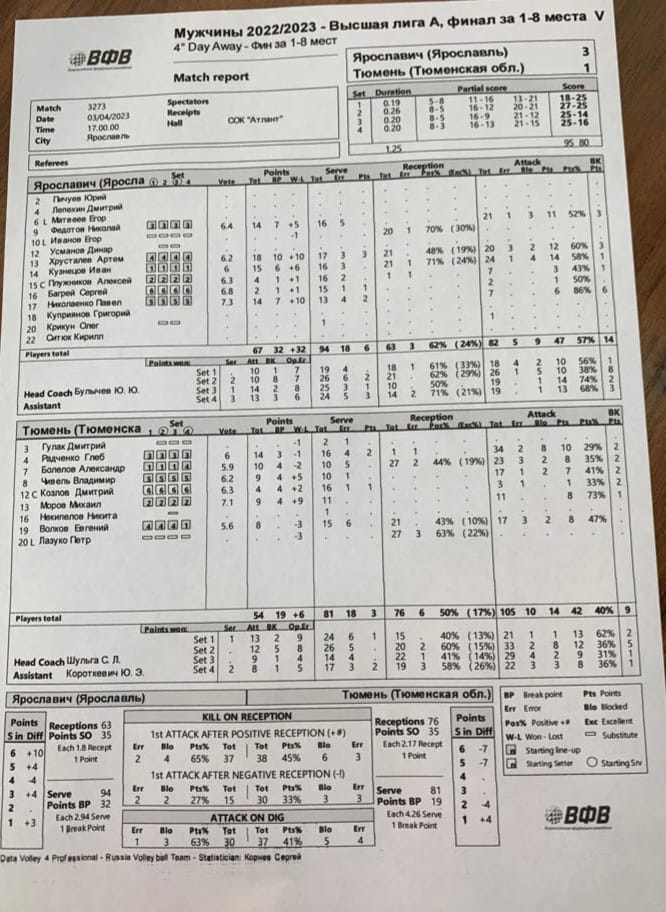 Самым результативным игроком в составе «Ярославича» стал доигровщик Артём Хрусталев, заработавший 18 очков (12 атак, 3 блока и 3 эйса). Следует отметить, что блокирующий нашей команды Павел Николаенко поставил 6 результативных блоков и реализовал 6 атак из 7 попыток (86% эффективности).